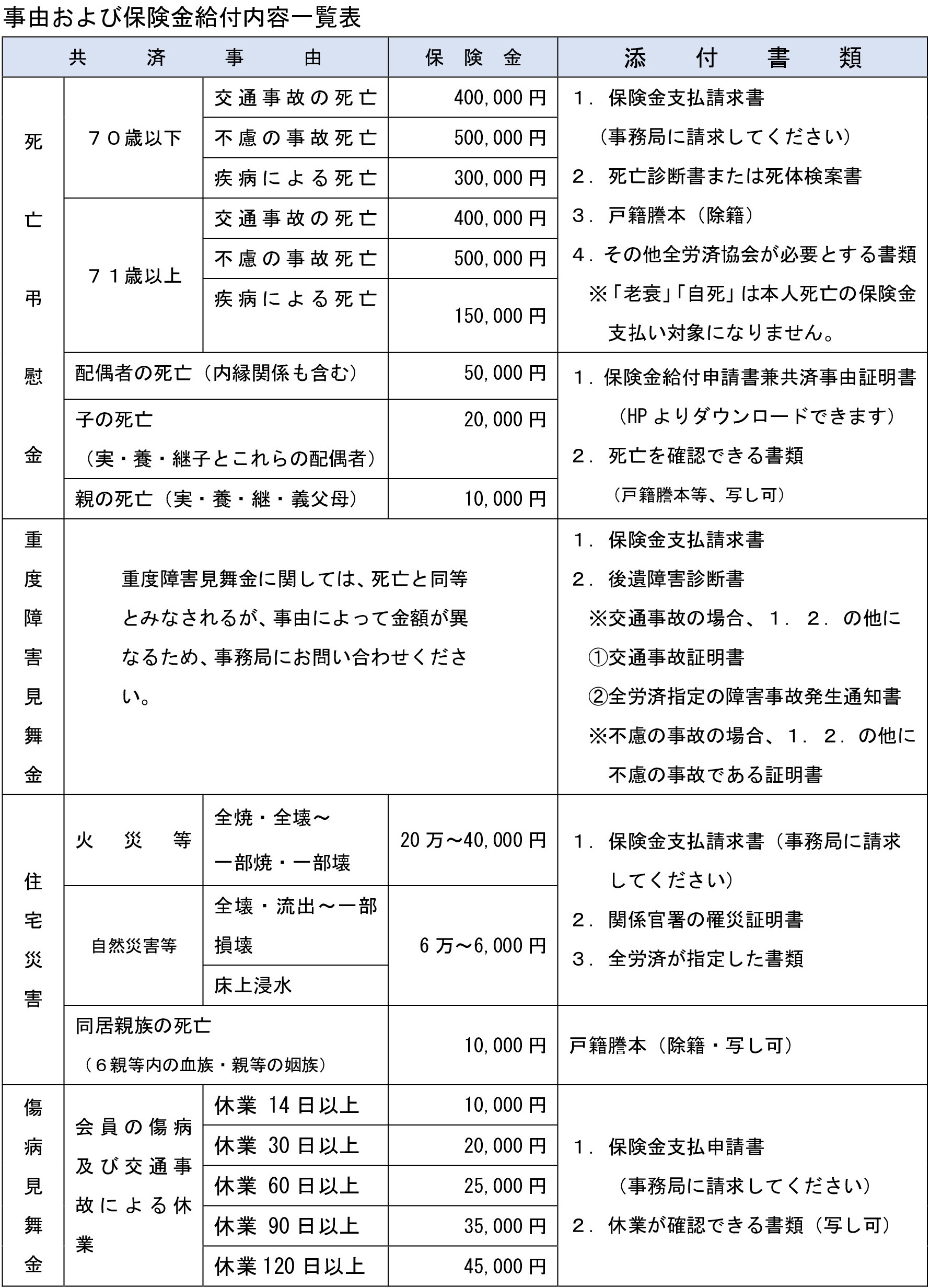 会員に給付する保険金は「事由および保険金給付内容一覧表」のとおりです。